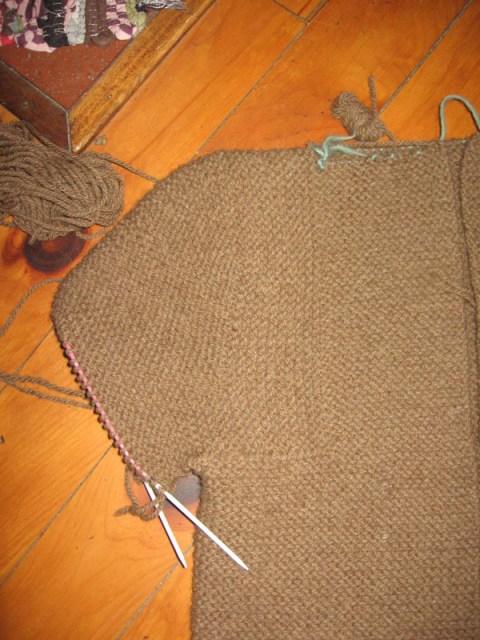 Right now I have one shoulder pad shoulder and one too short arm and I am hesitating to rip either. The sweater is living on my living room floor, until I get around to ripping the sleeves out and reknitting them.