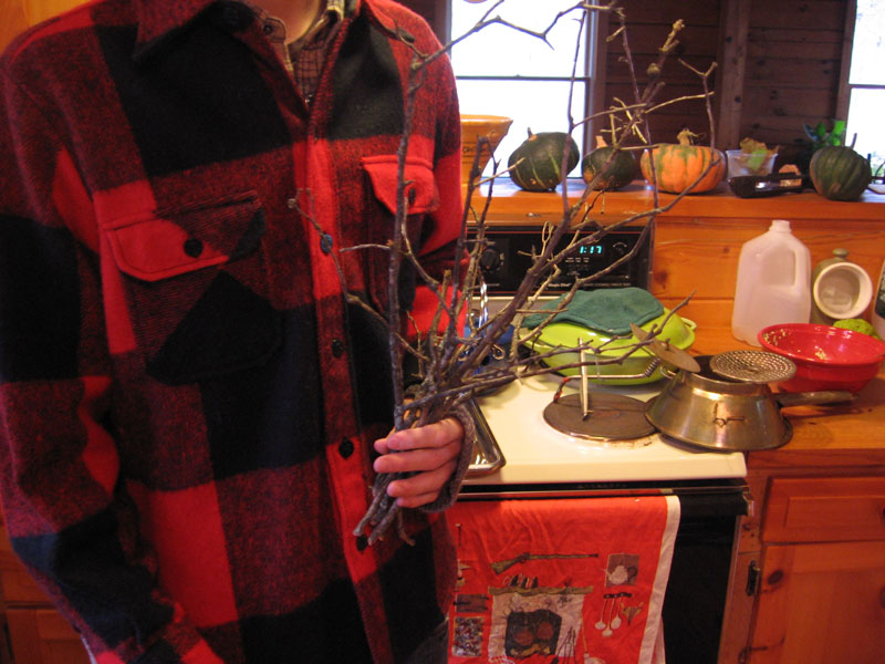 I sent Skye out to forage for the bird legs in the yard. He came back in, and we broke off a good bunch for our legs.