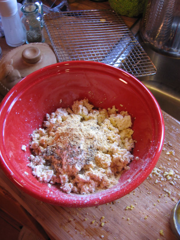 I went over to my mom’s house this morning and borrowed her hand written recipe card for tofu turkey legs. The general recipe is vague. I ended up adding a lot of sage to make the tofu taste good. And quite a bit of pickle juice from some bread and butter pickles that I made in the summer. Salt and pepper, mustard powder, and more sage. And some fresh parsley from the garden (still going!!!). And cornmeal for texture.