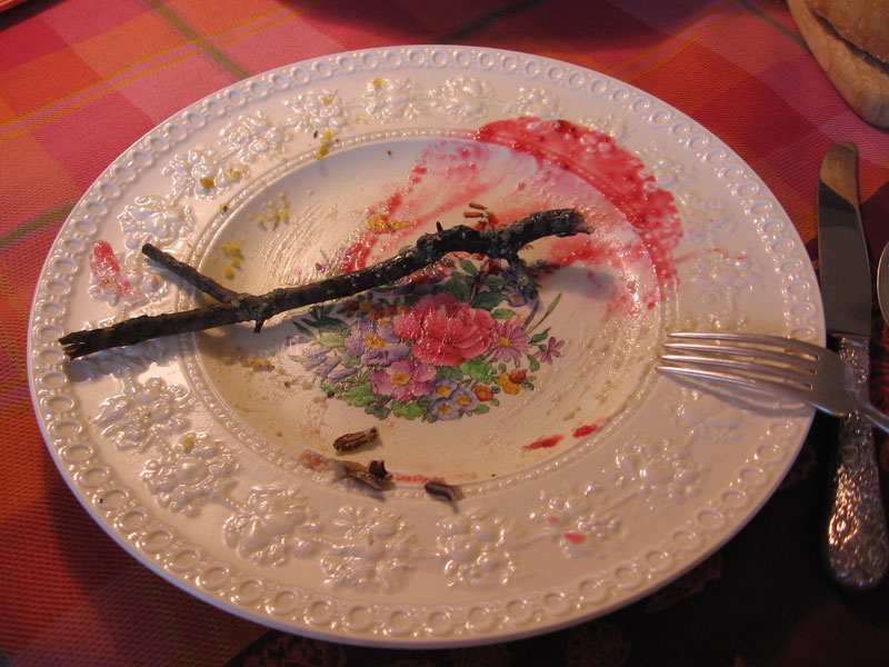 I just love the finished dinner plate. Fancy china, freshly polished silver, pressed linen tablecloth, and a lichen covered dirty twig. hehehe