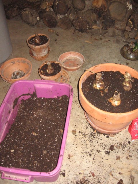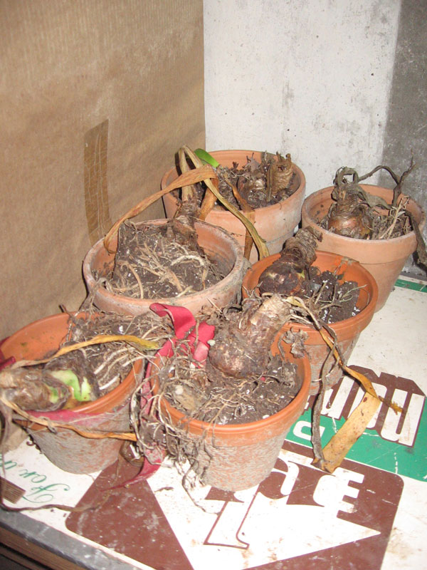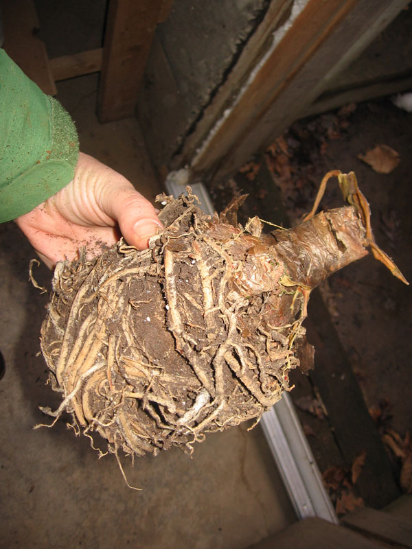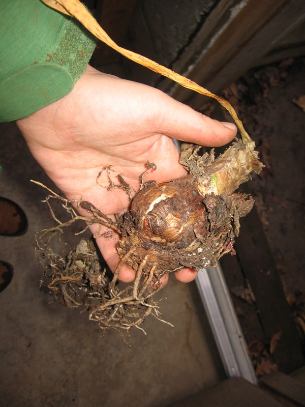 Every summer I take all my bulbs outside to a sunny spot, water and fertilize them, and then bring them inside before the first heavy frost. I keep them in my basement for the fall, allowing the leaves to die back and the bulb to dry out. Below is a dried out bulb and root ball that I have had for about 5 years. It is getting pretty big, and even has a baby bulb starting to grow off of the side.