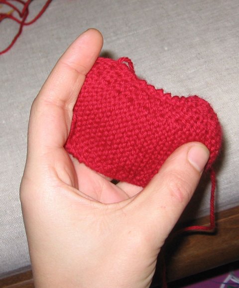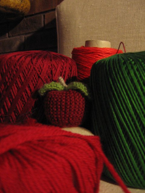 Yarn scraps in various shades of red, green, brown, or anything else that you might like an apple made out of. And some wool batting (you can also use polyester, but I find that stuffing with wool makes a much nicer feeling object. You will also need a sewing needle and some knitting needles that coordinate with the yarn (a tight gauge is good for this project).