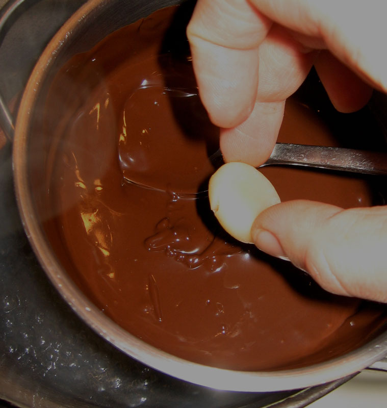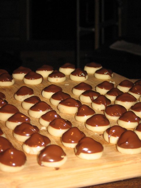 Once you have finished making the candies, you can dip them in melted dark chocolate. This step is optional, but I definitely love adding the brown cap. Kind of like a little acorn. I melted my dark chocolate chunks in a double boiler that would have made my sister squirm. But I only dropped the chocolate pan into the water once, and the finished product came out well, so I think it was okay. I guess the main thing with heating chocolate in a double boiler is that you don’t want the top pan to touch the water below, or the chocolate will get too hot. (If you have any questions, just call Heli-Claire!)