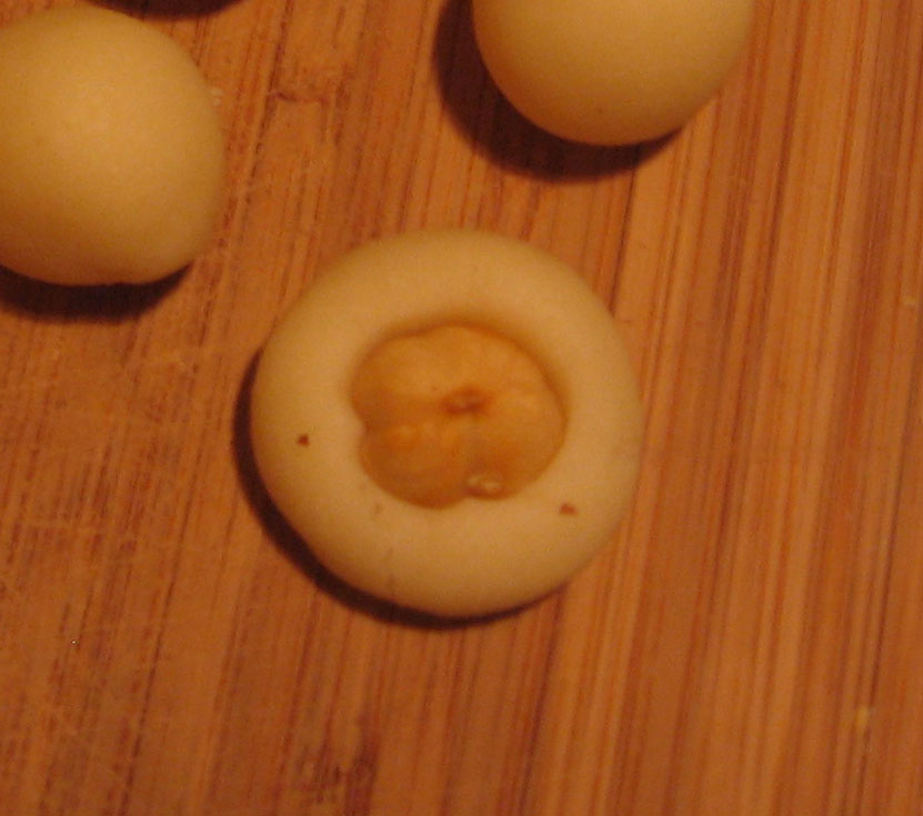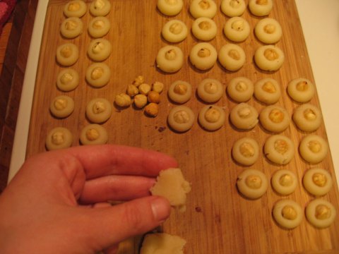 When you have made a few balls, press a hazelnut into the top. I like to have the point of the nut facing up. Because marzipan dries out quickly, it is important to do this in batches so that the edges don’t crack. Make a few balls, add the hazelnuts, and continue like this.