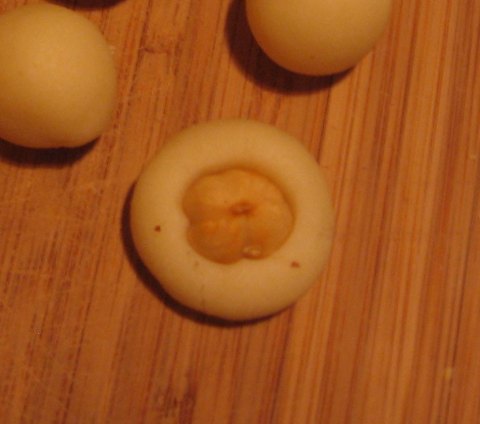 The next step is to pinch off a piece of marzipan and roll it into a little ball.