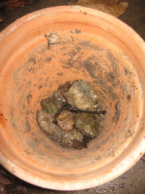 After the rocks goes some of the soil, about half way up. Then comes the bulb, and when nicely situated, the rest of the soil. Below are the finished pots of bulbs. I took them upstairs to the bathtub to rinse off any excess dirt, and they are now in the sunny windows! I am hoping that they all bloom this year, but I am not sure that they will. I wasn’t as good as I should have been with over the summer care (water and fertilizer). Will just have to wait and see. There are 6 bulbs all together, so hopefully some of them will bloom. If not, I will just have to look after them better next summer.