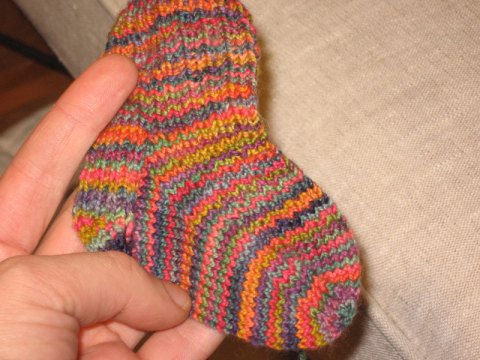 The multi-colored socks are for a friend that is expecting her first child this spring. She doesn’t know if she is going to have a girl or boy, so I found a ball of yarn that was very colorful and cast on. I started by casting on 24 stitches (for some reason I had this number in my head) and after about 5 minutes I realized that I was knitting a sock for my thumb. So I went up to 40 stitches, and that worked well. The yarn is Koigu KPPPM, a worsted weight merino wool that is machine washable. I love love love it for knitting socks, little scarves, etc. It softens with washing, and wears beautifully.