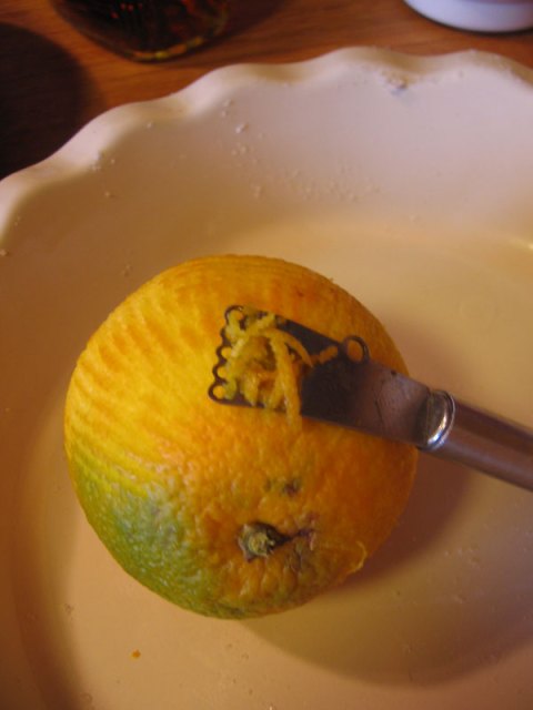 I used one of my favorite tools on this project; a citrus zester. There are sharpened little circles across the top, and you drag the zester down the side of the orange (or lemon, lime, etc) and it peels nice even strips off. The hole on the side is for larger pieces of zest. I am not much of a gadget person, but this particular tool is awesome!