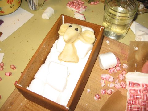 Thursday morning, after another trip to Hy-Vee, this time for junky powdered sugar and egg white powder, I assembled the pieces and stuck them together with royal icing. Royal icing is the best icing for this kind of thing. It is made of sugar, egg whites, and water. It tastes kind of gross, but when it is dry it holds like a ROCK. (When I was in 2nd grade we had a gingerbread house party for my birthday and the person who was in charge of the icing used some other recipe, and we had a night of houses falling all over the place!)