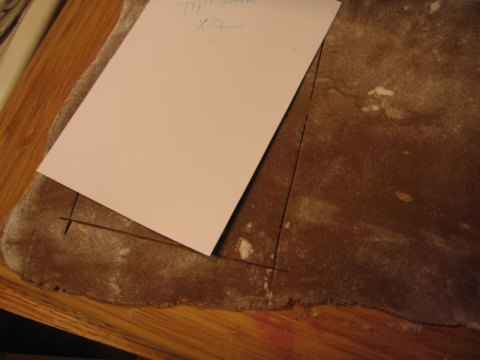 Tuesday night I made what was the first of many trips to Hy-Vee for a new jar of molasses. Batch two, on Wednesday worked out much better. I was still afraid of chilling the dough so I just rolled it out warmish, and cooled the pices on a cookie sheet on the porch before baking since it has turned bitterly cold here. I made the design for all the pieces on stiff paper, and then placed the paper directly on the cookie dough, on a cutting board, or directly on the cookie sheet, and cut out the shapes. It is harder to keep the shapes exact when the dough is warm, but I managed ok.