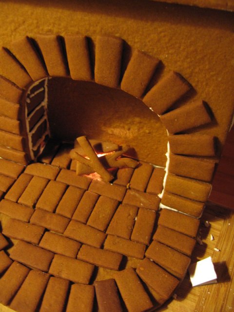 I made a piece of gingerbread for underneath the bricks, and then glued them all on with the royal icing. The fire was lit up from underneath with a christmas light. I ended up painting some of the logs red later on down the line.