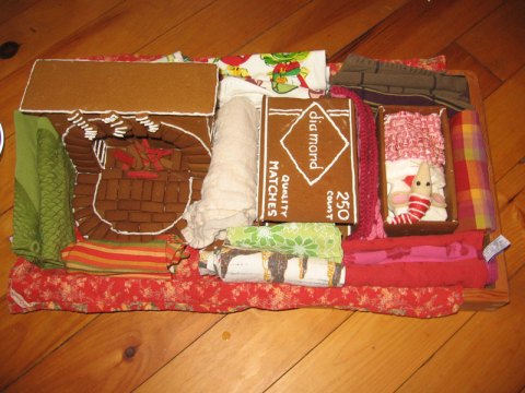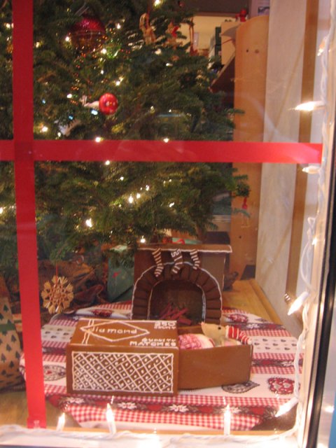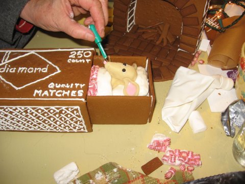 This was my mom’s idea. (And borrowed from an adorable product that we are carrying in the store.) A mouse in a match box. An “easy” way to do the whole ginger bread thing. We made a mistake a few years ago and spent hours and hours on our gingerbread house, and after that decided that we either wouldn’t do one, or plan something simple. For those who don’t know, the first Friday of every month in our town we have an art walk. Somewhere along the line the December art walk (they all have themes) got the theme of ginger bread houses. Now in December every store, restaurant, gallery, etc., has one or more ginger bread houses displayed prominently in the windows. Ours isn’t quite a house, but in my mind sleeping quarters count too.