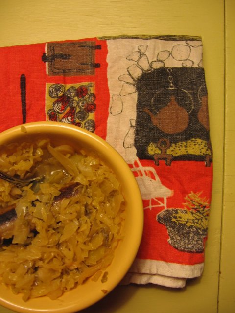 Now, you either love sauerkraut or you hate it. I (in case you haven’t noticed) love it. Pretty much any way. Out of the jar, with potatoes, out of the jar, on pizza, etc. When my dad served some veggie bratwurst last week with some of the sauerkraut that I had given him, I remembered back to the recipe, and decided to give it a vegetarian try. First I browned the bratwurst in a little oil in my skillet and set it aside. Then I chopped up some onions, cooked them in a little oil, and added some diced granny smith apple. I have a vague memory of Lucy using a granny smith, but I am not exactly sure. When the apples and onions were slightly golden, I added the sauerkraut (well drained), some “winter broth” (optional), a little water, and the bratwurst, then turned the burner to low, covered the whole thing and simmered it for a while. When it was finished, I cooled it and YUM! What a delicious, simple, hearty meal for a snow storm (ok the snow is tomorrow, but I can pretend!). Now I just want to curl up into a ball and go to sleep.