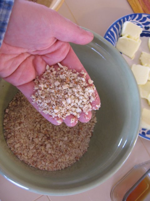 We first chopped the nuts, rather coarsely in the food processor. Then we creamed butter and sugar, added vanilla and sour cream (egg replacement), and finally the flour. The dough is rather dry and crumbly, but you don’t want it too moist, or it will turn a little cake like and the cookies won’t be as crisp.