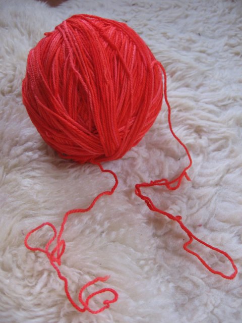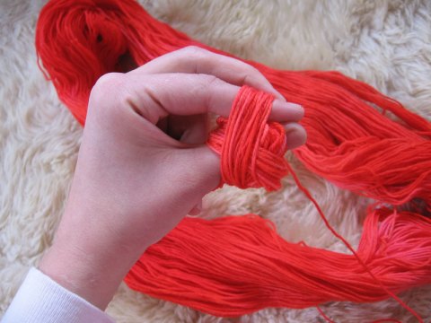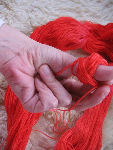 Start by taking off the ties that bind the hank. It is important to take care not to tangle the ball of yarn, as this can quickly turn into a disaster. (Never knit from an unwound hank of yarn!!)
