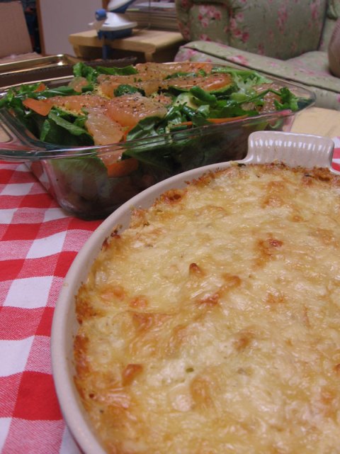 To go with the casserole, she made a salad of lettuce, and ridiculously fresh arugula, topped with avocado, grapefruit sections, and carrot ribbons. YUM!