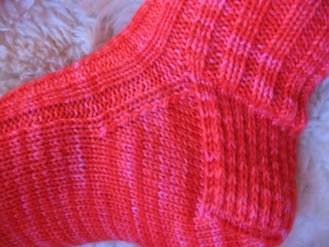 Sometimes I like to make two socks at the same time. There are benefits and drawbacks, but overall, I enjoy the process and it seems to keep me entertained. Back to the Valentines day theme (I love a holiday that involves pink, red, orange..), I was feeling inspired to make another pair of pinkish socks. And this was a yarn that I haven’t seen worked up. It is a trekking yarn, made in Germany by Skacel, and this particular variety is 80% wool, 20% bamboo (or something like that). I haven’t made socks with bamboo yet, and I love trekking yarns, so thought this might be fun. We only ordered one bag of this yarn for the store and I couldn’t help myself!
