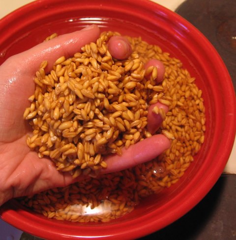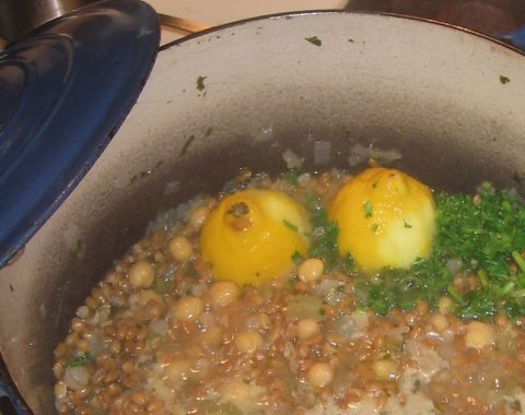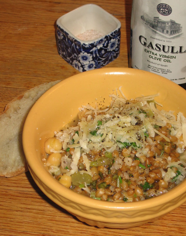 The main ingredients were broth, chickpeas, and farro (for which I substituted soaked spelt, with a slightly chewier result).