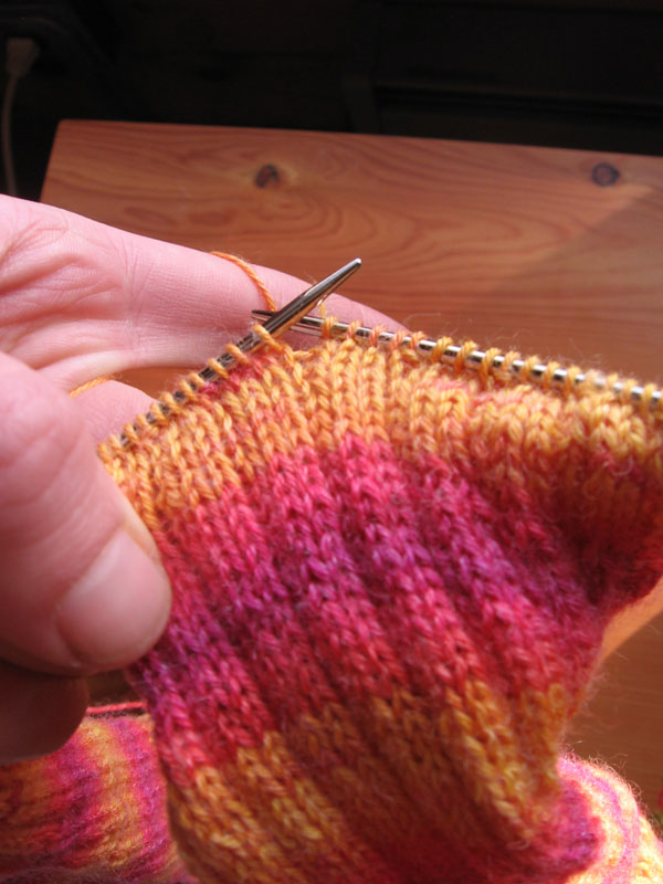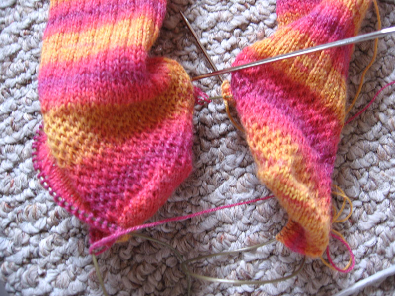 The socks are cast on, one at a time, and then knit, one row on sock one, one row on sock two. I am working the heels, first the flaps, one row on each. The heel is turned, one sock at a time. For picking up and knitting the gusset, the socks are then worked one round sock one, one round sock two. The gusset always feels like it takes forever for me. And when there are two socks at once thing, it takes forever times two. After the heel is all the way turned, I usually feel like I am home free. The rest of the foot and toe work up quite quickly, and as a project nears the end it seems to pick up speed as well. (Maybe some sort of terminal velocity thing…)