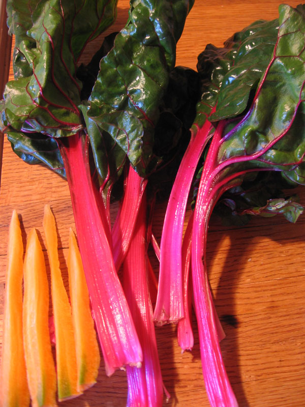 I was working on a project this morning, and when it got time to make lunch I realized that I didn’t have too much time. I wanted something hot, and so I rummaged around in my fridge and pulled out a handful of rainbow chard, a carrot, and some cheese, and olives. I made a grilled cheese sandwich, and on the other side of the grill I sauteed my chard with olives. It was a yummy treat, and so pretty to look at!