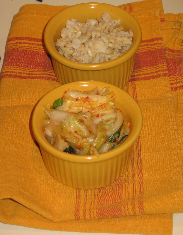 I opened my jar of kimchee today. According to my recipe it said 3-6 days sitting, depending on how sour you like it. A much quicker turn around time than its Western counterpart (sauerkraut)! I was kind of excited to try the finished product, so I called it finished after 3 days. And to be honest, it doesn’t change much in color, and seems to mellow somewhat in flavor. Actually, mellow isn’t really the right word. Maybe more like the flavors come together. My kimchee ended up very spicy, very garlicy, and full of ginger! A perfect combination to keep healthy in this cold weather.