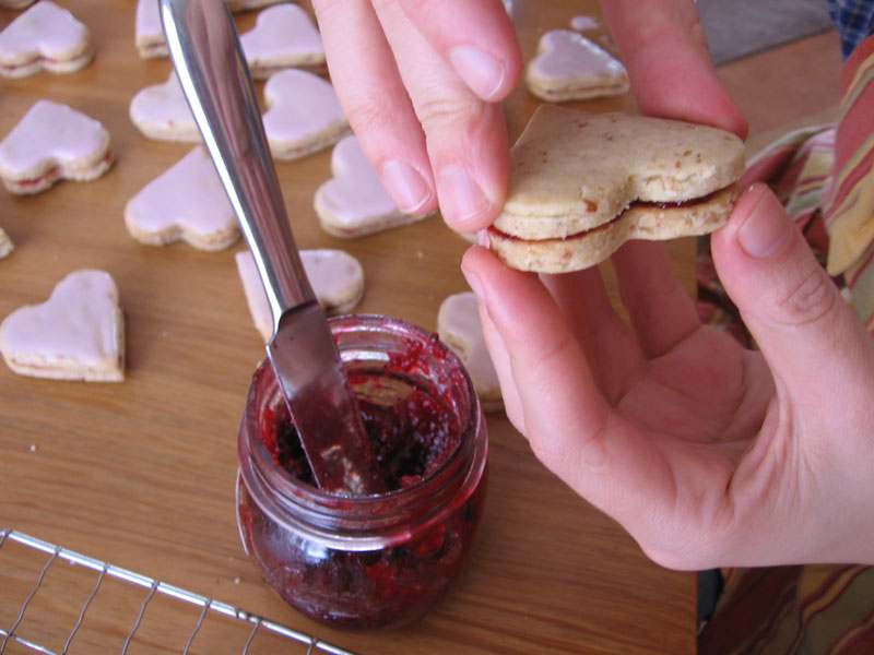 Once the cookies were cooled, it was time to spread them with jam, and make little cookie sandwiches. I saved a jar of homemade raspberry jam that I made this fall for the center layer. I put on just enough to make the cookies stick, making sure that nothing dripped down the sides of the cookies.