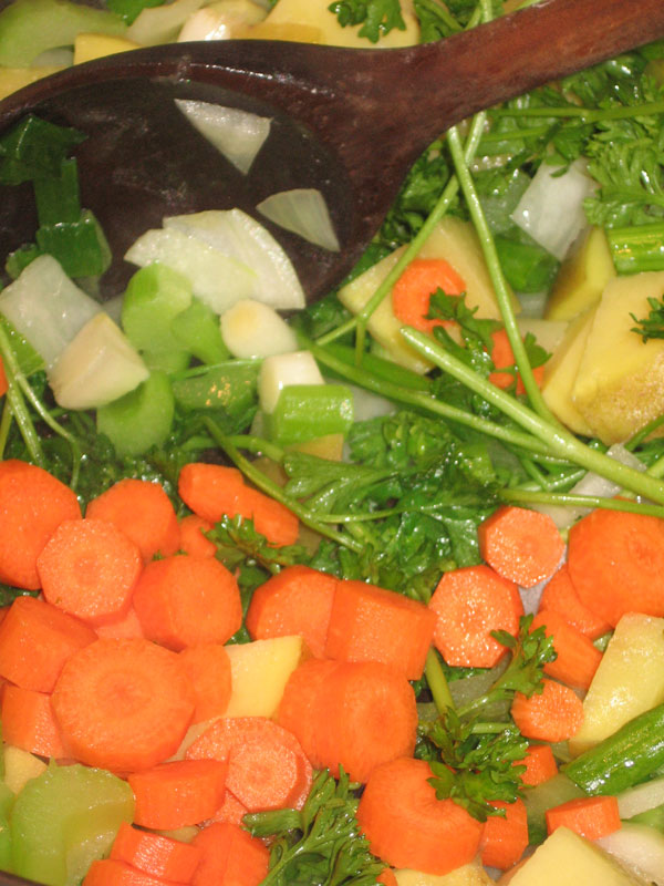 I started the soup with a bunch of fresh vegetables, and made a stock. I like to make home-made stock, although sometimes I just don’t have the time to do it. This particular soup calls for chickpeas, so I added the chickpea broth (made with garlic, onions, bay leaves, parsley, and peppercorns) to the soup as well.