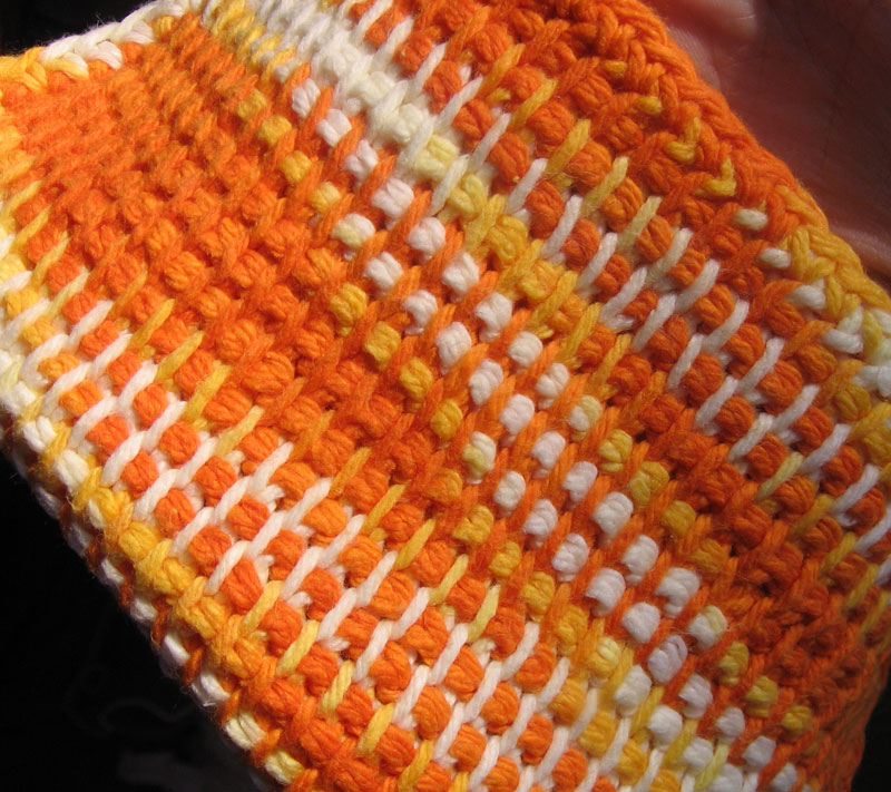 Here is attempt number one of Tunisian crochet. I have been meaning to get around to this for a while. This morning, when I got into work, I grabbed a ball of Peaches and Cream multi colored yarn, and a wonderful crochet hook with a long cord (also known as an afghan hook). The stitches are worked back and forth on the right side of the work, picking up the horizontal loops while working to the left, and getting rid of them as you work back to the right.
