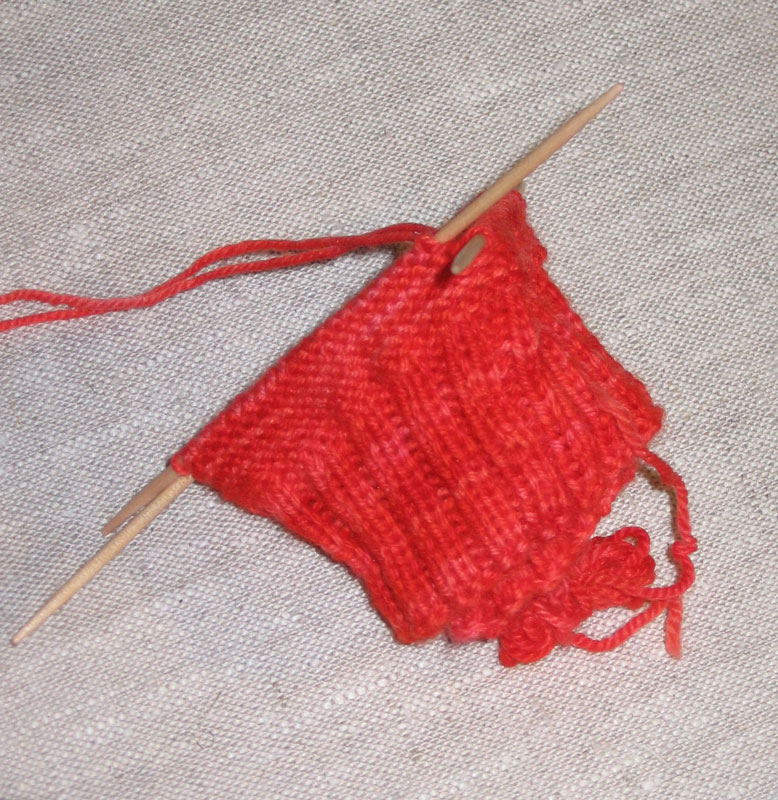 The right sides of the cast on edge were on the outside, and the wrong sides were together, so I had to twist the stitches so that they were opposite, as the socks are knit with the right sides together. I got through the cast on and knit 2 purl 2 ribbed border with several mishaps, and learned to make sure and check my work REGULARLY so as not to accidentally connect the two socks…