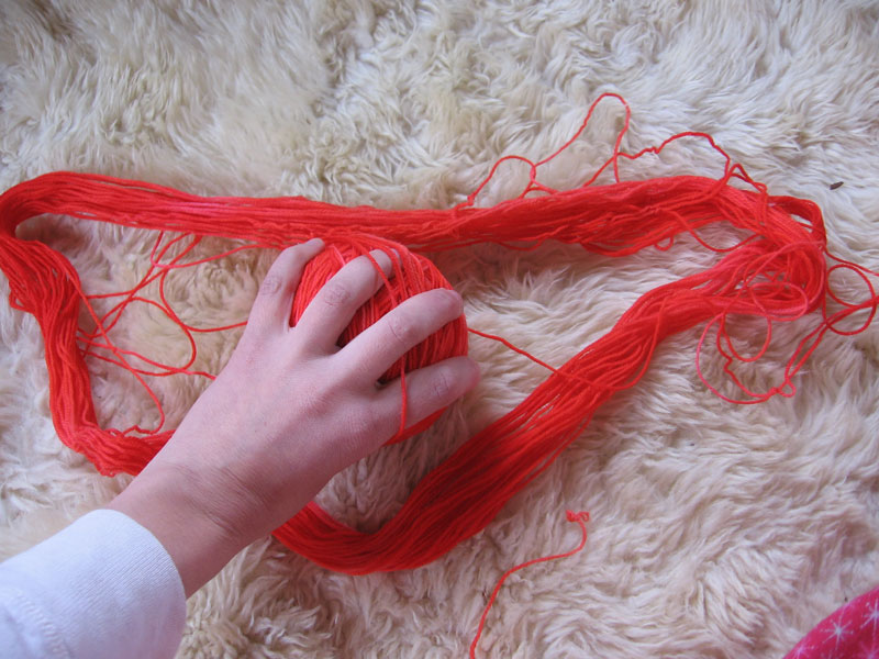 I lay the yarn on the floor, sometimes on the back of a chair, or over my toes, to keep the threads straight.