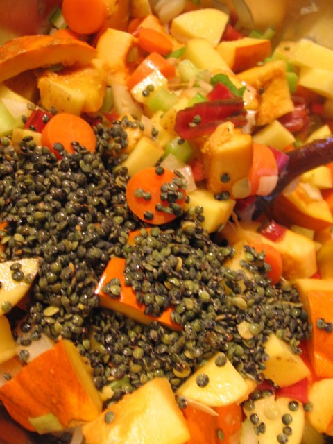The lentils add a nice bit of body, and depth to the flavor. The colors of the vegetables are already fading as they cook down..