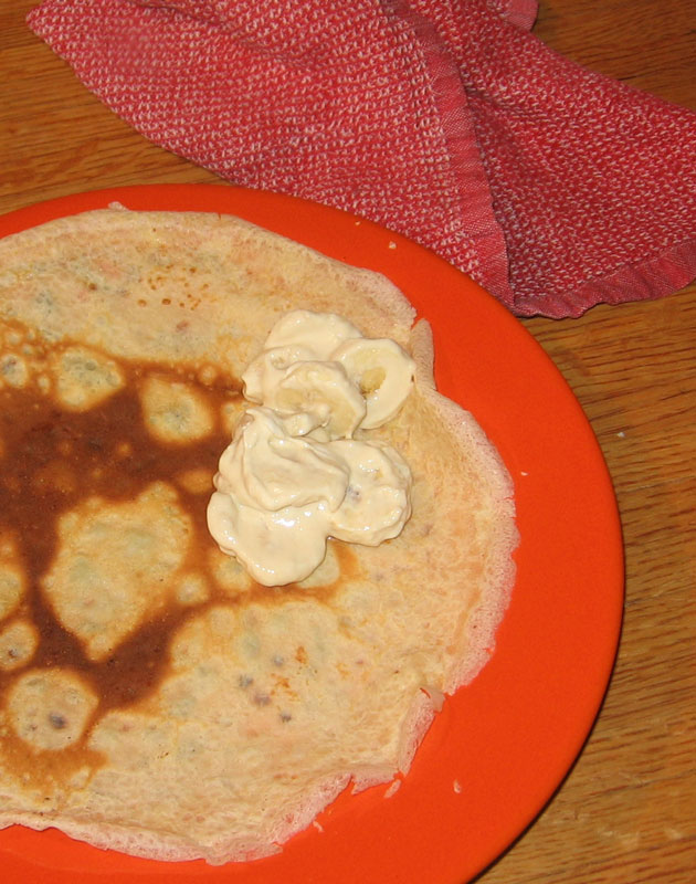 Cleaning out the fridge this morning I found some eggs, two bananas, and 1/4 tub of sour cream. I put them all together, along with flour, sugar, butter, etc., and made crepes with banana sour cream filling, flavored with Haitian vanilla!