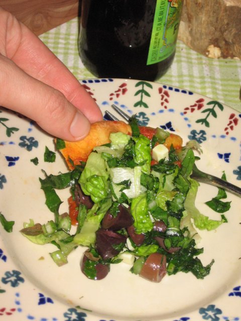 I woke up from a nap this afternoon craving crunchy romaine lettuce ribs and finely chopped kale. To turn this into dinner, I put my third (and final) frozen pizza in the oven, chopped my romaine and kale, both from my awesome CSA, and set out to make a dressing. I wanted to make something that would taste pizza-ish, so I used olive oil, white balsamic vinegar, and oregano. I added salted mountain capers, chopped olives, and pepper. For protein, I thinly sliced some Parmigiano Reggiano for the top of the pizza, and added tiny cubes of cheddar to the salad.