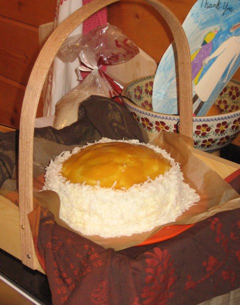 I frosted the outside of the cake with cream cheese butter frosting (cream cheese, butter, and powdered sugar from the baking mix “packet number 3”). I dusted the sides with coconut flakes (from “packet number 2”). For the top I put a layer of passion fruit coconut jam for brightness and color (also my mom’s idea).