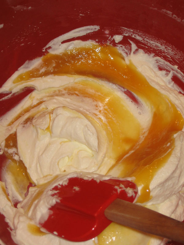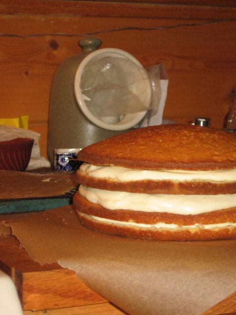 I made a filling of Greek style yogurt, coconut passion fruit jam from France, and whipped cream (also my mom’s idea). I softly whipped the cream (1/2 cup) and gently folded in the yogurt (about 2/3 of a container), which is strained and quite firm. The mixture was quite tart, and so I added a lot of the jam to sweeten and flavor it. The cake itself was sweet, so I didn’t make the filling overly sweet.