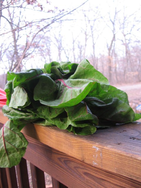 To cook the chard, use a little olive oil, (mine was flavored with Tunisian olives and harissa). To the oil, add chopped onion, chopped celery, and saute until the veggies are translucent. Then add roughly chopped chard and cook it until tender. Salt and pepper to taste. Covered the chard, and placed in the oven on warm.