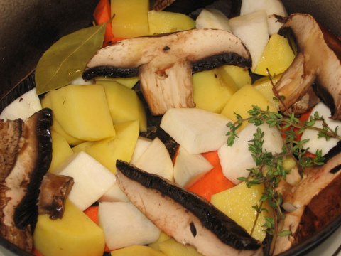 It all started out with the broth. A hearty mushroom based broth that is so thick you can’t see through it. With that already made, I didn’t have much to do. Cut up and roast the vegetables, with aromatics and red wine. Turnips, carrots, portobello mushrooms, potatoes, and several sprigs of thyme.