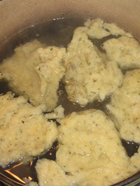 Meanwhile I mixed up the batter for, and cooked the dumplings. They were rosemary dumplings, with an egg, some flour and a lot of fresh rosemary chopped very finely. For some reason the dumplings ended up too mushy, and full of water. I am going to have to look at the recipe and maybe compare it to some other ones to see what to do differently next time. Also, I salted the water as I do pasta water, and this turned out to make them a little too salty. That said, I still liked them in the soup..