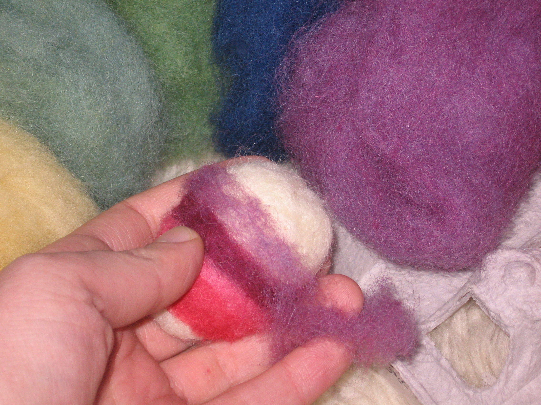 After the initial egg was shaped, I added strips of color, tacking the strips down as I went with the needle.