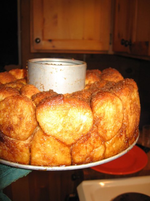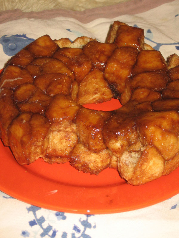 When my friend Danielle posted about monkey bread on her blog, I decided that I had to make some. I got the recipe from smittenkitchen.com (suggested by Danielle) and it was clear, and very easy to follow. I have a ledge in my kitchen and I set my computer right up there and follow away. The only problem is if I have to scroll down a page with my sticky fingers…