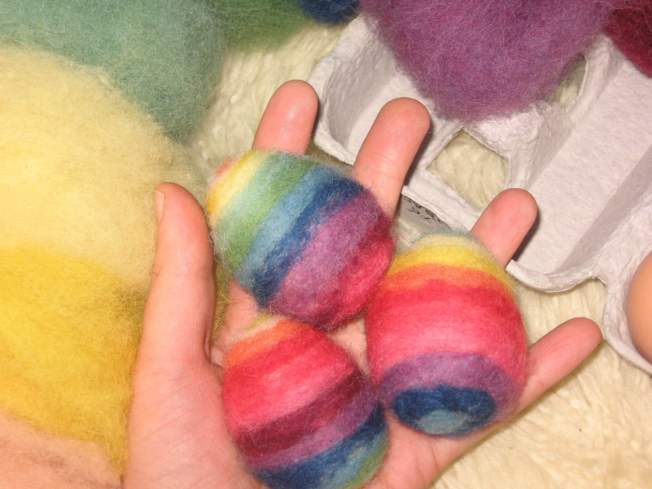 My friends Reni and Joy have been making some really cute Easter eggs with wool, decorating them with colors, patterns, animals and leaving some just brown. I kept wanting to make some, and finally, today, I grabbed a bag of wool, some white wool batting, and a package of needles, and took it home after lunch to experiment.