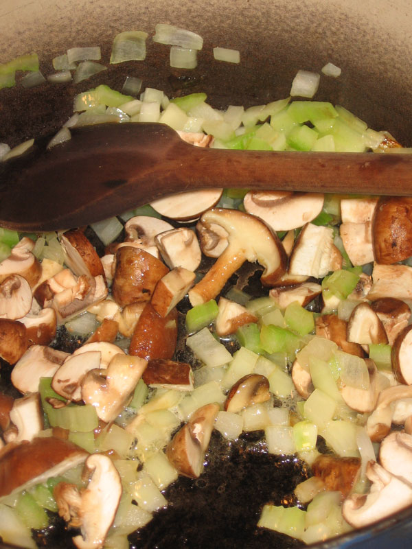 Then add several handfuls of mushrooms (I used a combination of shiitake and crimini, roughly chopped). My mom once told me that sauteing mushrooms in butter brings out their flavor, so I usually try to do this for soups, etc.