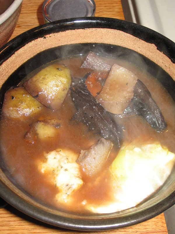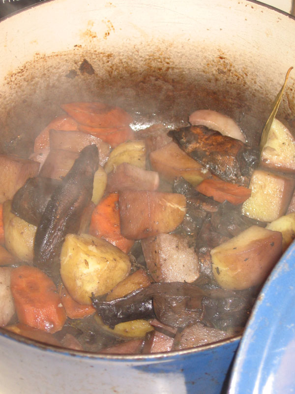 I have been talking with my friend Theo about making pot au feu since we made pho a few months ago. A sort of pot au feu anyway. Something vegetable and warm, and roasted, with mushrooms, etc. We even looked at the recipe the other day. And I got inspired to do it, unfortunately while he was away at a whiskey tasting convention…