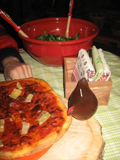 My mom brought a little hen over for dinner to peck at the edge of the pizza. I actually lit it on fire (it is a candle..) later on, and am still not sure if I am okay with burning chickens…