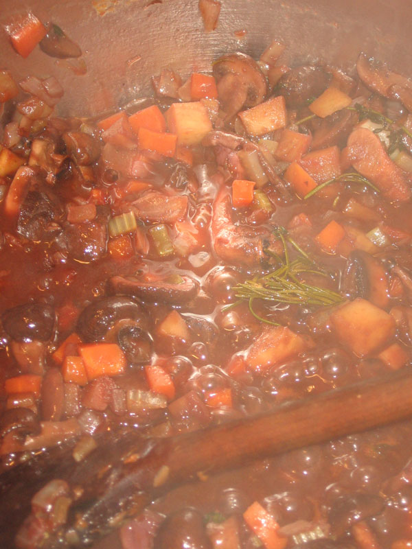 After the vegetables and herbs were lightly browned, I added tomato paste, flour, wine. The alcohol is burned off by boiling, then I added the dried, soaked mushrooms and their water, and simmered the whole pot for about 45 minutes.