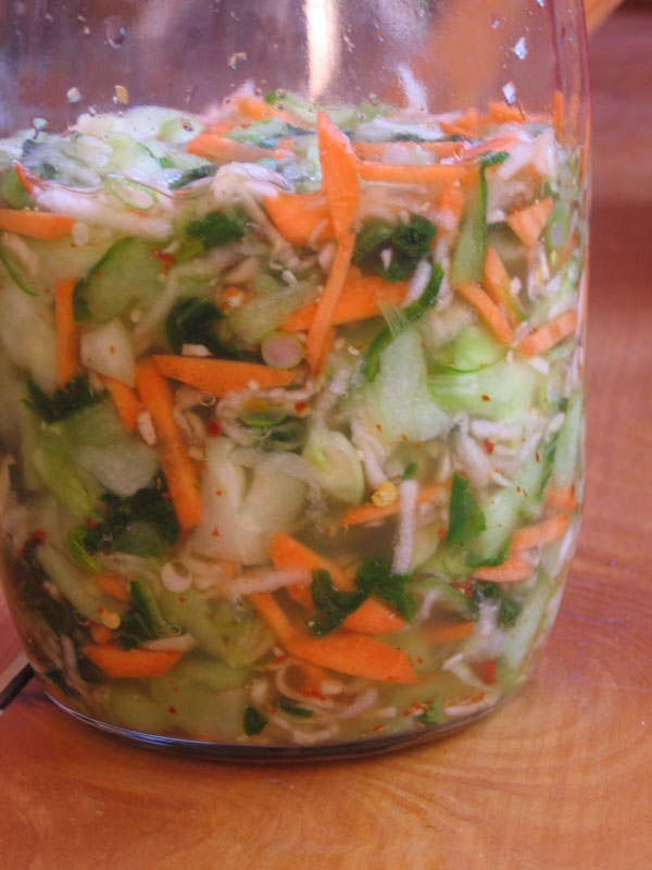 The kimuchi now has to sit, loosely covered, for a few days before it is ready. My last batch has been living in my fridge now for about a month, and it seems to get better with time. The flavors aren’t quite as sharp…