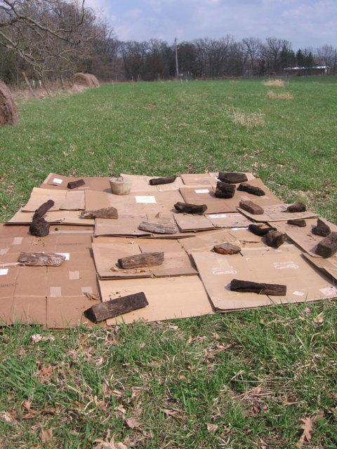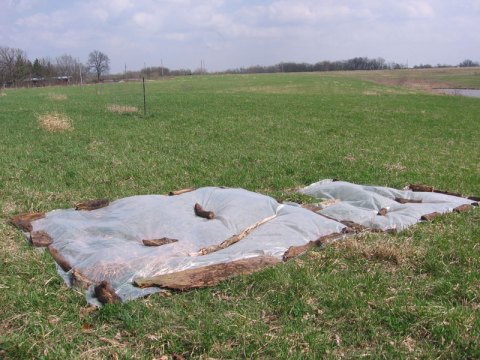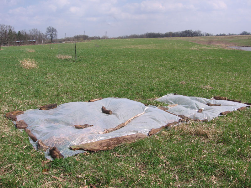 We started preparing the pumpkin patch. I have a sneaking suspicion that the entire patch that we staked out won’t be completely covered. It is a huge spot, and we started preparing at the west the corners. In one corner we put some plastic. A sheet of clear plastic, held down by logs, is supposed to “cook” the grass. At the same time, it allows the sunlight in, so the grass continues to grow (unlike with black plastic). The grass and root system then get tired from growing, and fried from overheating. Dead grass. When I write it all out like this, I feel a little bit cruel about the whole thing…After about a week, the plastic can be removed and placed on a new section of field, as the grass should be suitably cooked.