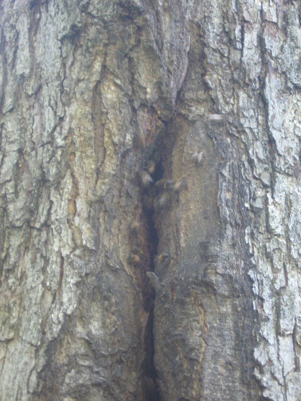 Moni suggested that I call some people south of town that come and collect swarms of honey bees for raising honey, and I gave them a call. By the time I had made the two calls, the bees already settled in a tree by my house. I almost couldn’t find them anymore. The cloud and loud hum were gone, and all that remained was a gentle buzz, until I reached the actual tree. When I got right up close, the bees appeared to be busy inspecting several holes in the tree. They were moving quickly inside and out, with a little cloud of bees constantly hovering around the opening.
