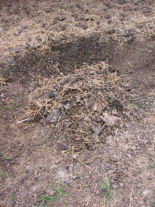 We broke through the cardboard and dug down about a foot, and then mixed the soil (a bit on the clay side) with about 1/2 a bin of llama beans. This formed a little hill, about 1 or 1 1/2 feet wide. We placed some hills towards the edges of the patch with hopes that the vines crawl out into the grass. The preparation of the field was hard. We were trying to get everything finished before the rain, and practically gave ourselves heat stroke. And of course it didn’t even rain here yesterday…I heard that it poured in town, but we only got a few sprinkles.