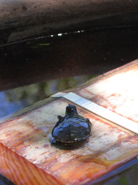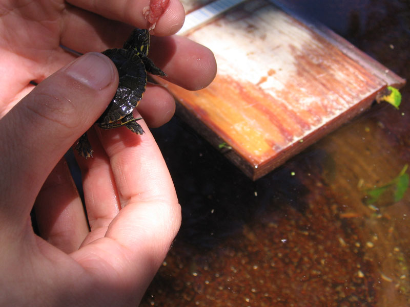 We found t.q. a few days ago on a gravel road. He (she?) was crossing, and I stopped the car right over him, got out, reached past the tire, and pulled him out! What a cutie. I think that he came right out of the turtle egg hole.
